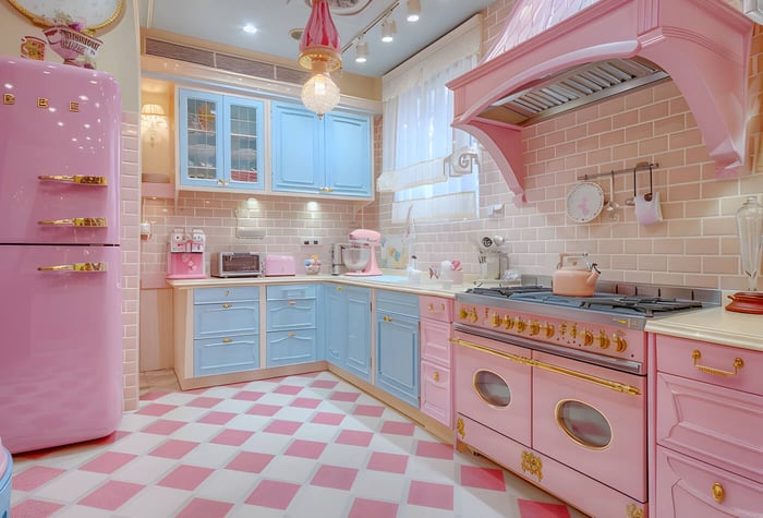 Appliances in pastel hues (light pink, baby blue) or gold accents (faucets, knobs) evoke a princess-inspired elegance reminiscent of Disney castles.