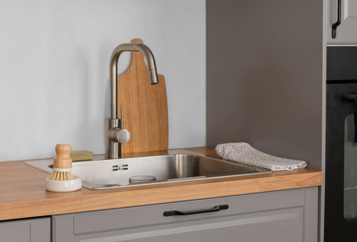 Keeping it simple around a corner kitchen sink is all about choosing practical accessories that don’t crowd the space. Try a compact roll-up drying rack that sits over the sink when needed and rolls away when not—it’s perfect for small spaces! A sink caddy that sticks to the side or suction mounts is great for storing a sponge and dish soap without taking up countertop space.